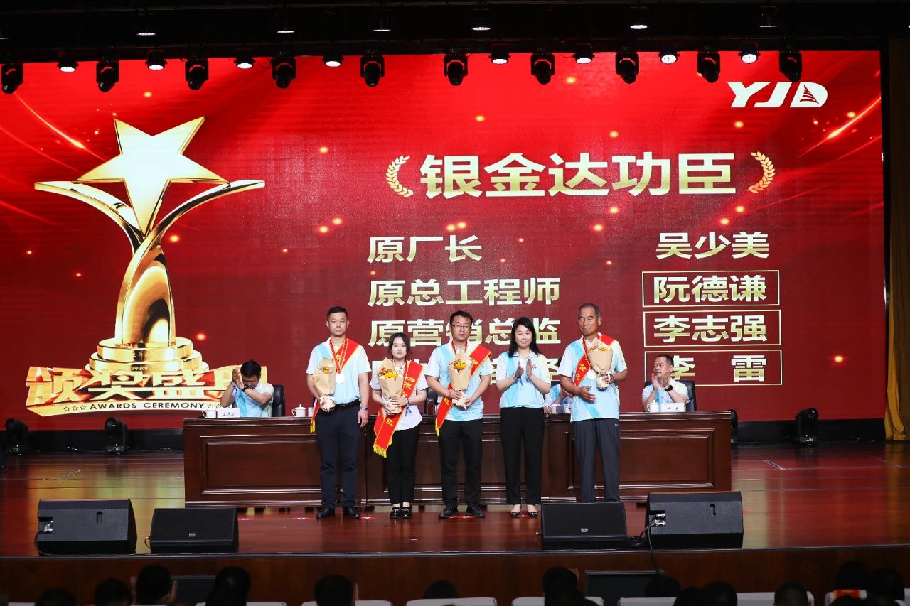 资深员工表彰环节温情涌动。37名十年资深员工、20名二十年资深员工以及三十年资深员工郜贵堂依次登台,他们用十年、二十年、三十年的坚守,诠释了与企业风雨同舟的深厚情谊。吴少美、阮德谦、李志强、李雷四位“银金达奖”获得者的事迹更是感人至深。创业元老吴少美在初创期挺身而出奠定根基;产业链总设计师阮德谦勾勒产业版图;销售铁军李志强将订单化作腾飞羽翼,开拓了大客户群体;外贸功臣李雷让银金达品牌走向世界。他们的奉献精神如星辰闪耀,照亮银金达前行之路。鲜花与喝彩,献给所有以坚守为笔、以奋斗为墨,书写企业华章的时光筑梦人。