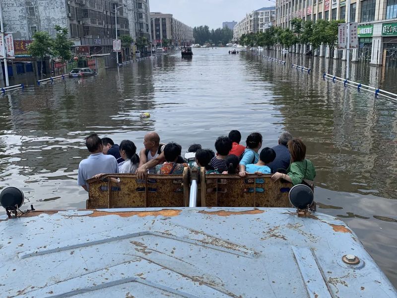 3、李沅鸿领队12人出动2辆铲车、2艘橡皮船、2辆班车、1辆集装箱车水中救援职工及其家属和受灾群众,运送至银金达安置点,并参加李良屯护堤防汛;